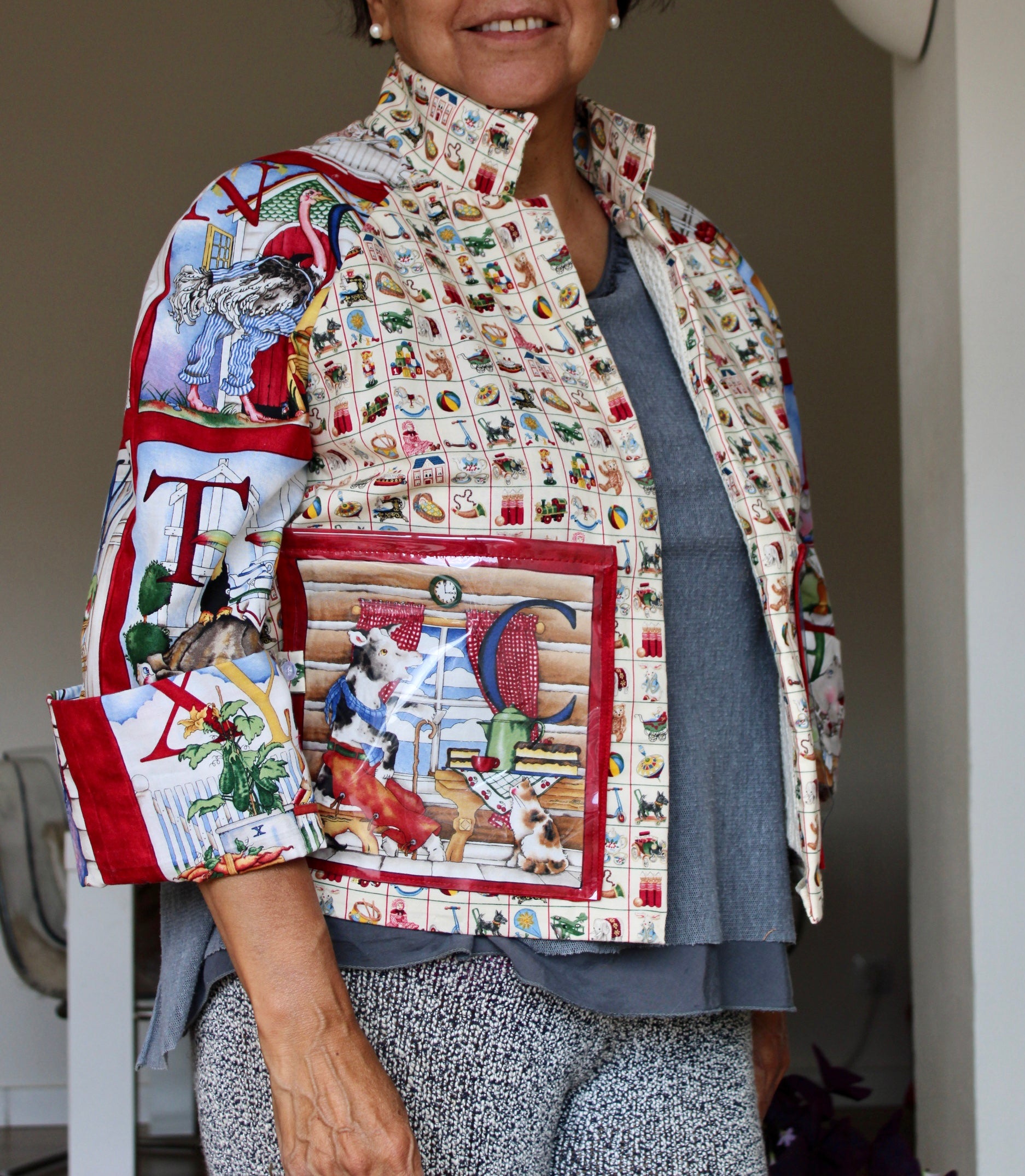 Introducing a handcrafted Raglan Jacket made out of Theatre Fabric and inside is from a recycled pair of trousers. Very playful and unique. It has two outside oversized pockets. For the inner child in you.